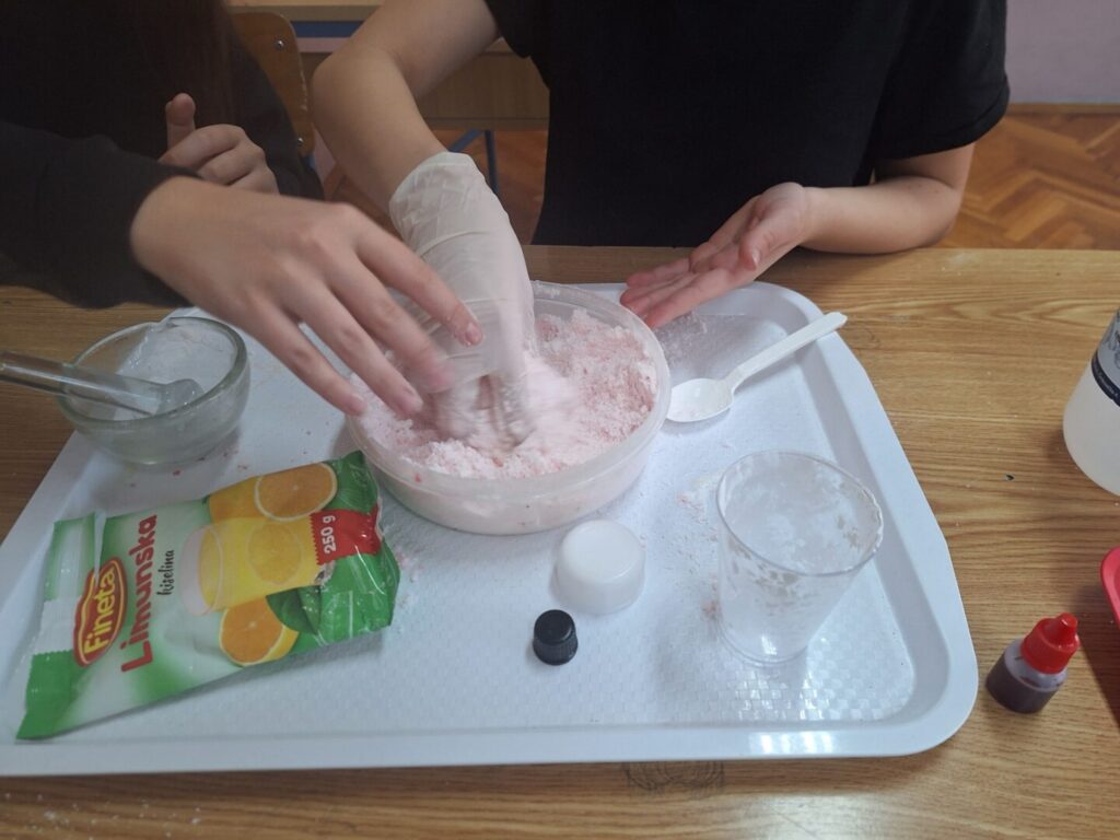 Učenici osmoga razreda izrađivali su božićne kuglice za kupanje – božićne šuškalice. Tijekom izrade koristili su sodu bikarbonu, limunsku kiselinu, prirodne boje i eterična ulja, te se upoznali s kemijskom reakcijom koja nastaje u dodiru s vodom. Praktičnim radom povezali su teorijska znanja iz kemije s primjenom u svakodnevnom životu, razvijajući pritom kreativnost i suradnju. Izrađene šuškalice bit će predstavljene i prodavane na božićnom sajmu.